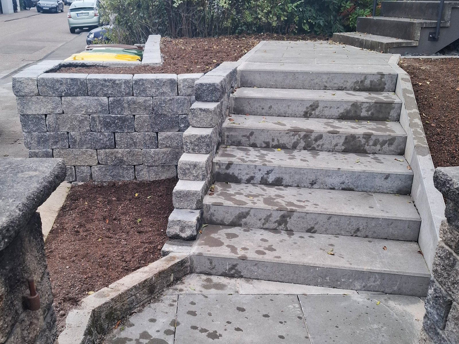Mit individuell geplanten Mauern und Treppen schaffen wir Struktur, Höhenunterschiede und optische Akzente in Ihrem Garten.
